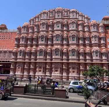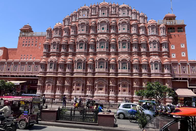 En Jaipur, frente a una calle bulliciosa y caótica, llena de motos, autos, comercios misceláneos y alguna que otra vaca errante, se alza el famoso Hawa Mahal, o Palacio de los Vientos. Lo curioso es que la vista más impresionante de la edificación se obtiene justamente desde esa misma calle, en medio del desorden cotidiano.